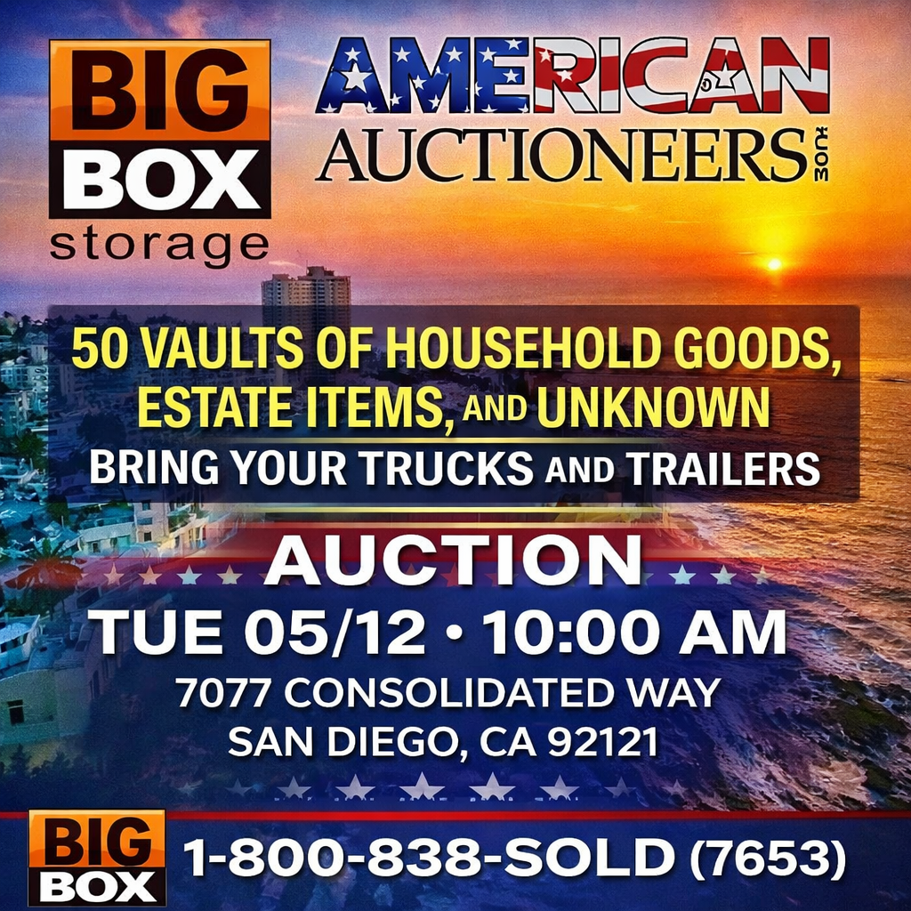 There is a 15% buyers premium on all purchases. Sales tax will added to all purchases unless buyer holds a valid resale permit. All purchases are cash only unless otherwise specified. All items are sold as is, where is, no guarantee or warranty. Removal same day as auction. All moving blankets are property of the facility and must be left at the facility the day of auction. No opening of boxes on facility property.